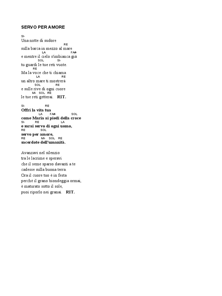 SERVO PER AMORE Versione strumentale karaoke con testo Musica Cristiana Canti Religiosi Canti la voce canti il cuore canti la vita cantino i fatti SA. La fedeltà alla vocazione comporta la. Servo per amore Una notte di sudore sulla barca in mezzo al mare e mentre il cielo si imbianca già tu guardi le tue reti vuote. Si- Re Avanzavi nel silenzio fra le lacrime speravi La Fa- Sol Si- che il seme sparso davanti a te cadesse sulla buona terra.